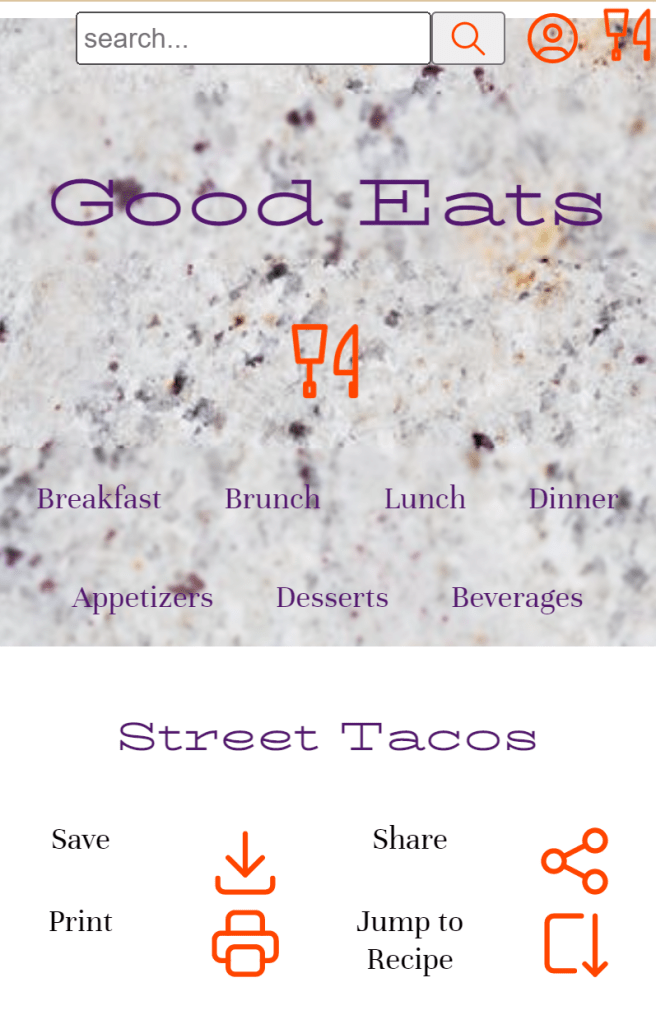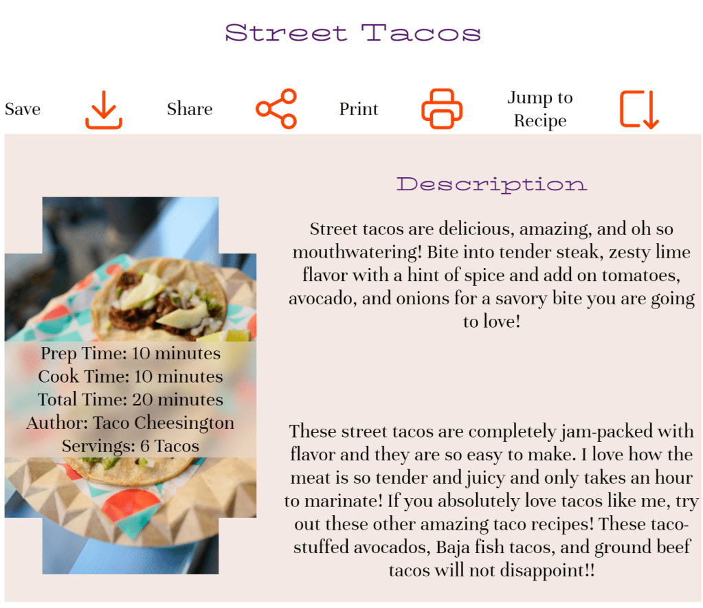 The buttons under street tacos could’ve been moved to the bottom of the recipe because it makes more sense to save a recipe after having seen the recipe than reading it, scrolling back up then saving it. It’s too many steps. The only necessary button up there is “jump to recipe”.