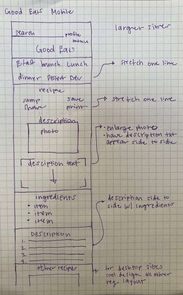 Mobile first is typically the best way to start and that is especially true for our website. The audience is going to pull up this recipe on their phone and follow along. The sketch made was only for mobile and assumed portions would just be added side by side or displayed in a fun way.