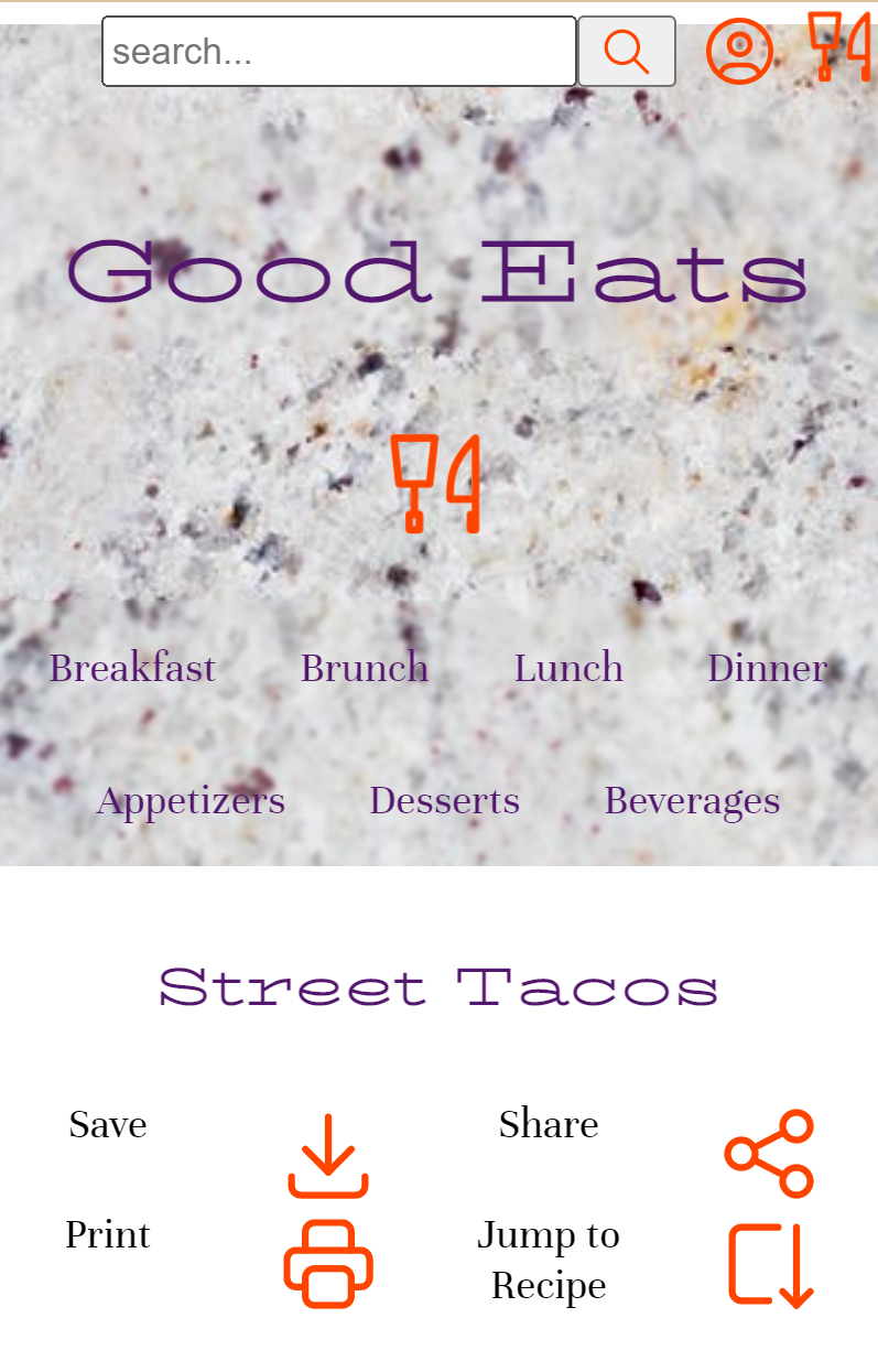 The marble backdrop was appealing, but it occasionally made itself too present. “Good Eats” was harder to read despite the blur effect added, which should have been spread throughout not just at the header and page nav bar. The logo did not need to be presented in the center when it was already at the top nav bar. The logo should be on the top left-hand corner of the page where it is expected to be. This would make it easier for our users.